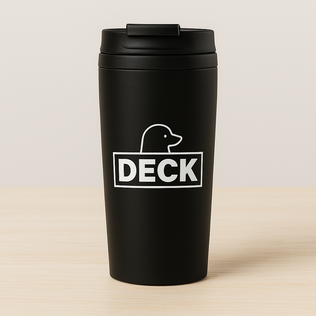 This sleek black tumbler features the iconic DECK logo — perfect for both hot and cold drinks, with a clean, minimalist look that fits any lifestyle.